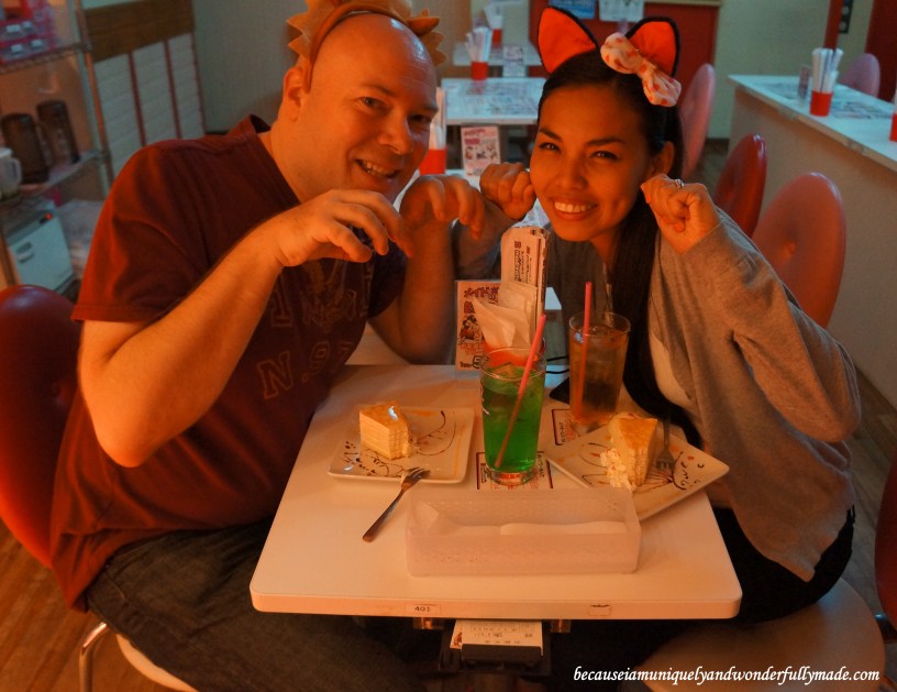 Immediately after we had settled ourselves in a pink-lit cafe, hubby and I had this I-cannot-wait-to-tell-our-friends-about-this look. One maid approached us and introduced herself. She welcomed us to the cafe and although I do not understand mostly what she was saying, I remember her very well uttering “Today you are a princess and you are a prince”. She then took out an electric candle which she asked us to blow as part of the opening ritual. She also made us wear headbands – I had an animal ear with a bow and hubby had a lion hair. I thought I was thunderstruck for a minute.