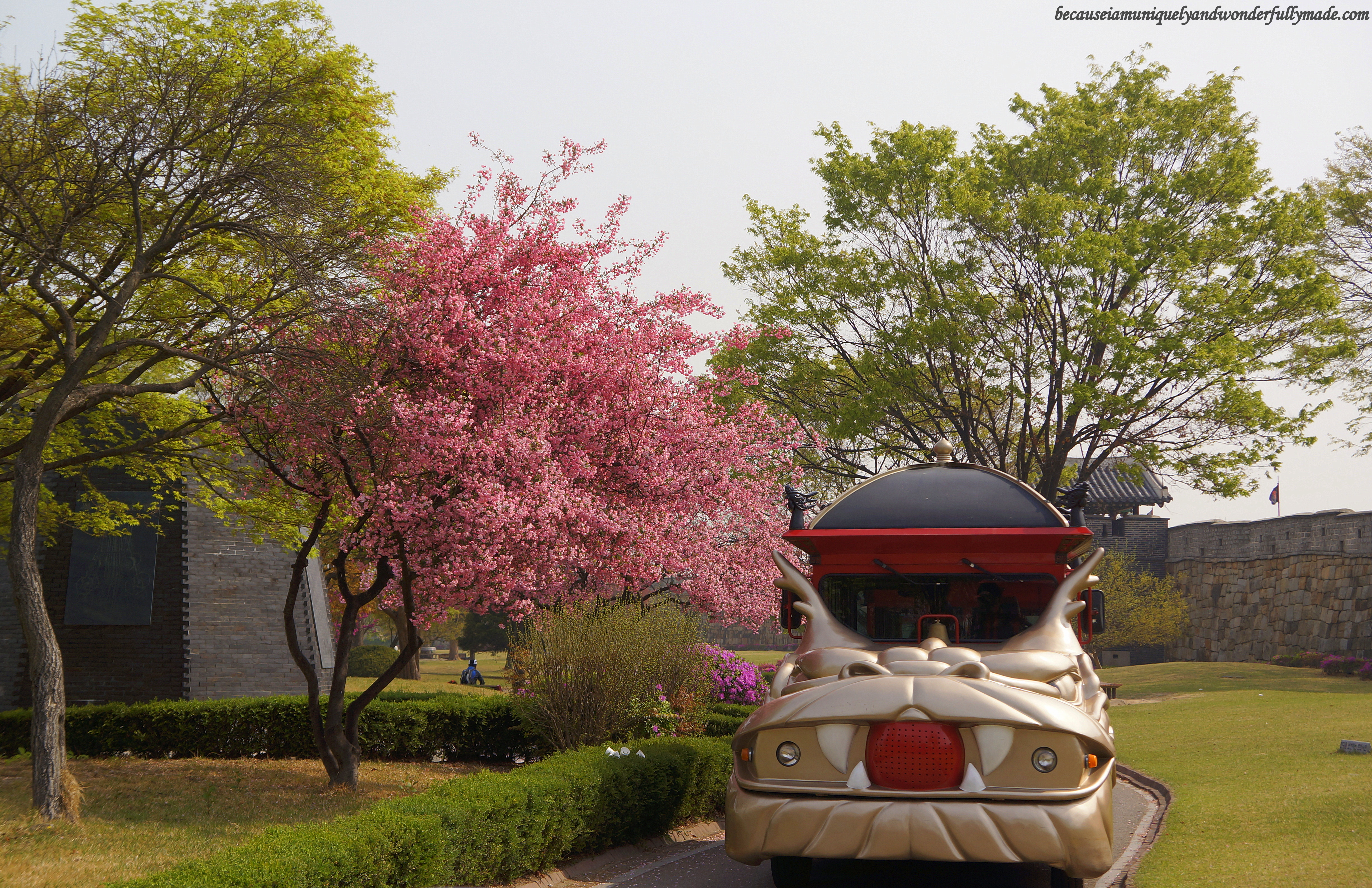 One of the enjoyable parts of the tour around the fortress is the ride on the Hwaseong Train Tourist that travels between Paldalsan Mountain and Yeonmudae. Boy, nobody gets to hop on a dragon train anywhere else than here. It reminded me of the anime Dragon Ball Z! However, I personally would have preferred walking around the fortress on foot, except that I would have died before I reach the mountain top. It was also spring-ish when we visited so there was a slight trace of Cherry Blossom left and it was splendidly beautiful.