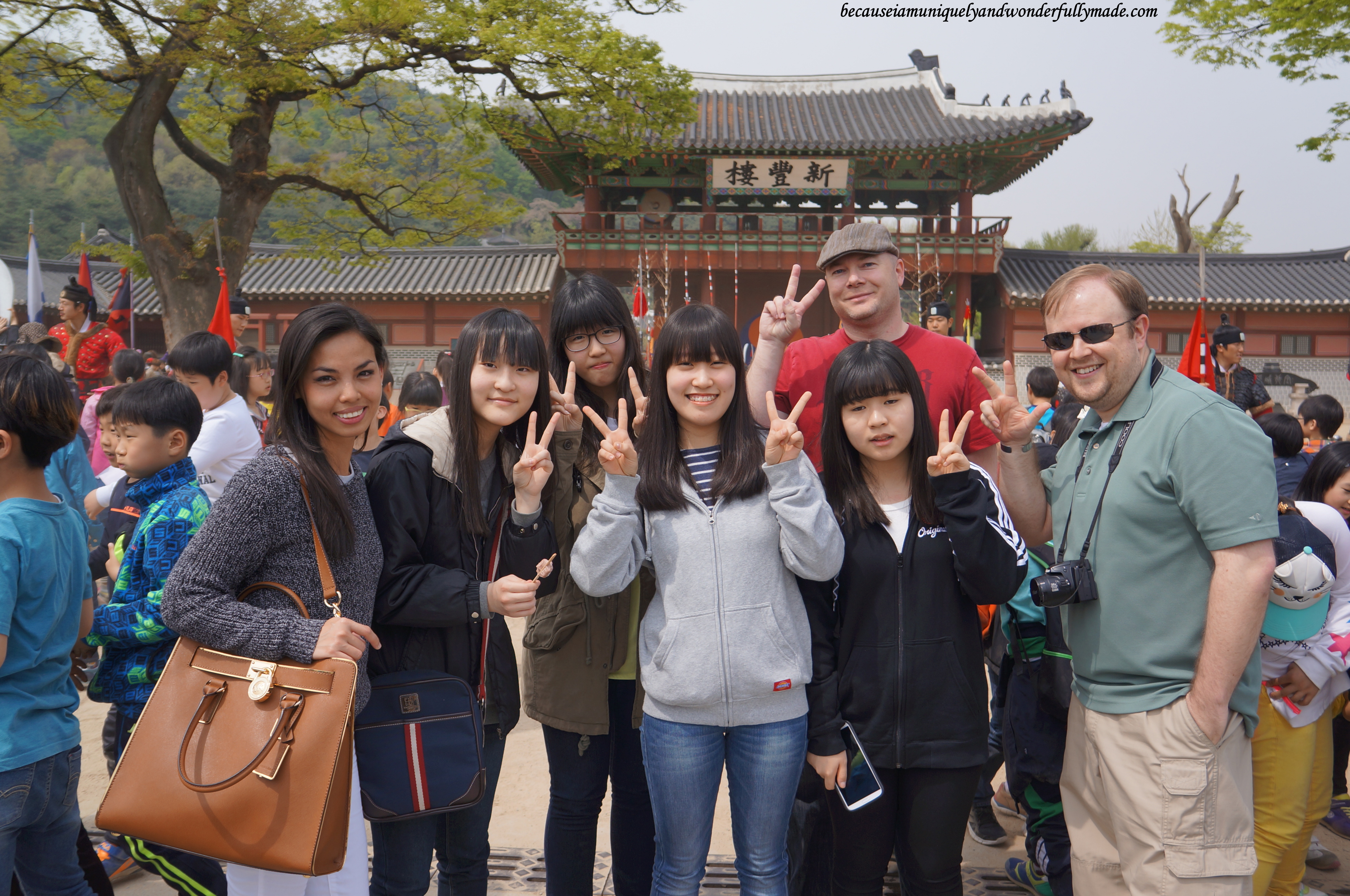 During our Kyoto trip and while in this Seoul tour , we have come to notice that it is normal to see an ocean of kids ( insert exaggeration ) touring around as well, running and shouting and just being, oh well kids. But everyone paused and gathered in front of Sinpungnu Pavilion at 2pm to wait for the 24 Moves Martial Arts show to begin. We all, without exemption, awed at the elite guards of Jangyeongyong as they showcase their 24 Martial Arts of Joseon Dynasty moves ala real life ninjas. The 24 Disciplines of the Military Arts, or “Muye 24 Gi” refers to the 24 disciplines of the military arts described in detail in the book Muye Dobo Tongji (The Comprehensive Illustrated Manual of the Martial Arts of Ancient Korea) that was published in 1790, the 14th year of the reign of King Jeongjo. Korean kids were also very friendly, asking us politely for photos with them.