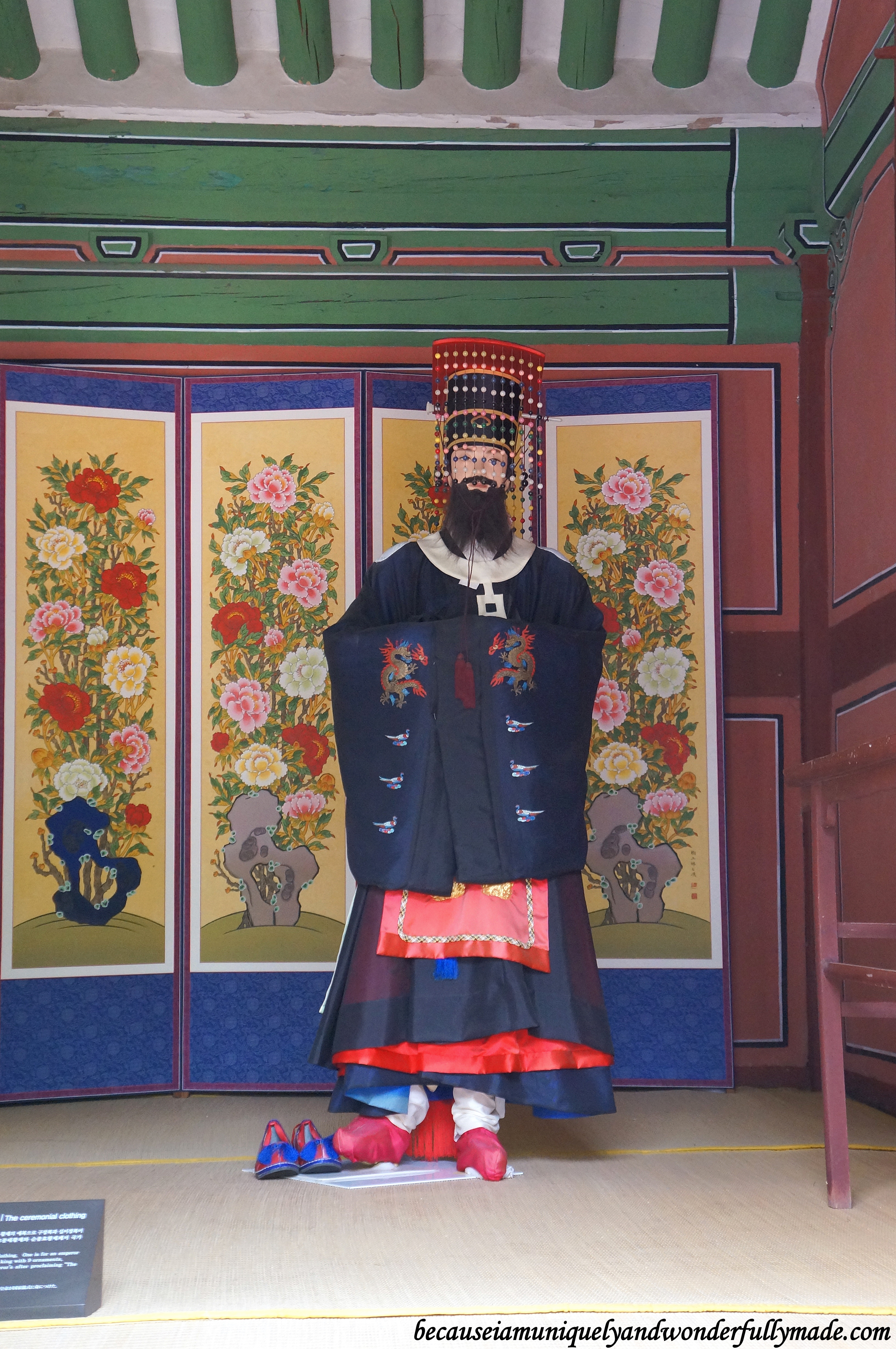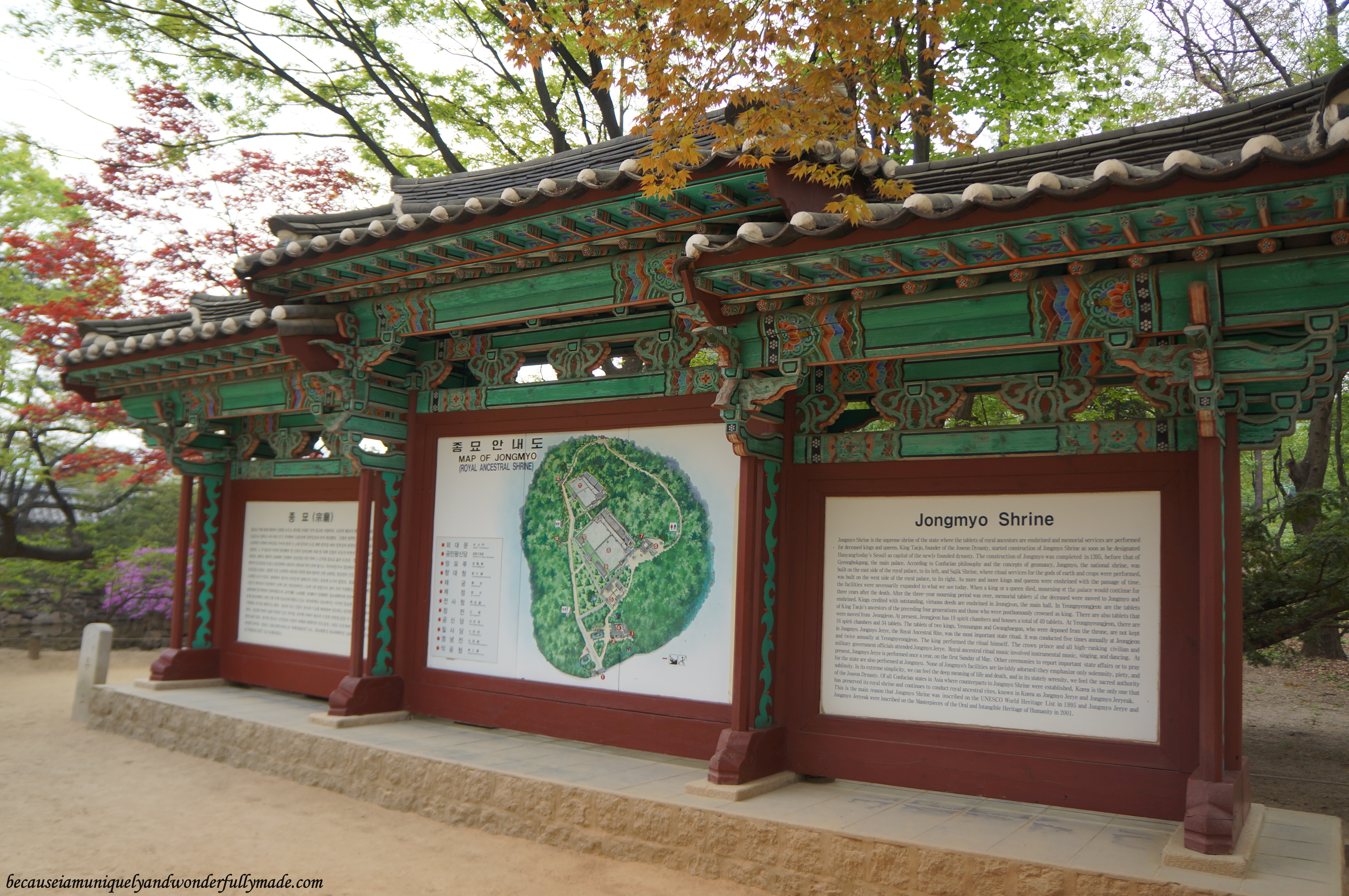 Our tour guide showing us certain paths that are only reserved for the king, the crown prince and the spirits at Jongmyo Shrine 종묘대제 in Seoul, South Korea.A solemn walk around Jongmyo Shrine 종묘대제 in Seoul, South Korea.The colors of red and green are used at Jongmyo shrine 종묘대제 to symbolize solemnity, piety, and sublimity because bright colors would not allow the spirits of the kings and queens to rest in peace.The colors of red and green are used at Jongmyo shrine 종묘대제 to symbolize solemnity, piety, and sublimity because bright colors would not allow the spirits of the kings and queens to rest in peace.The King at Jongmyo Shrine 종묘대제 – South Korea
