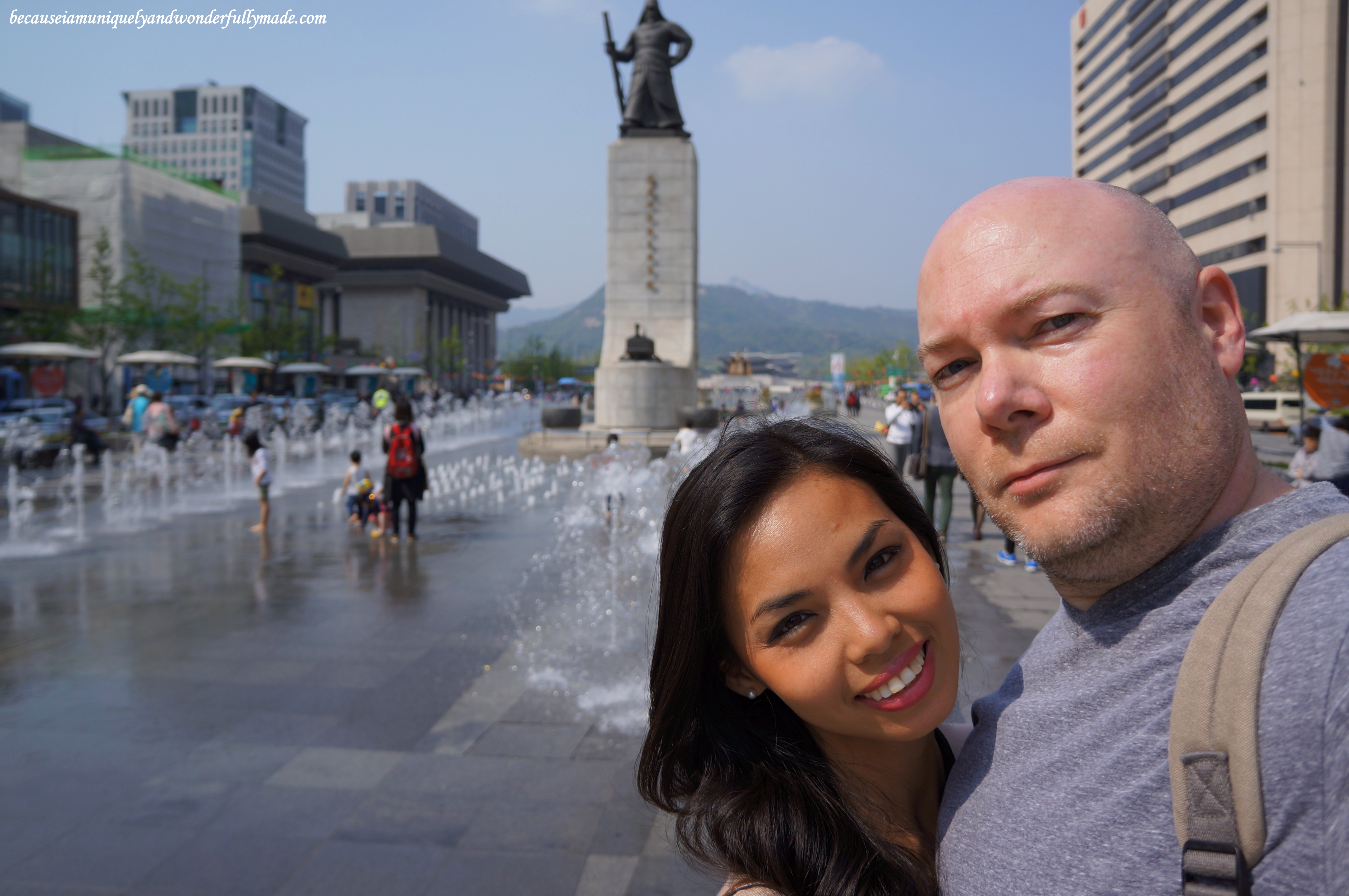 The main street leading to Gyeongbokgung is called Sejongno (세종로). This used to be a traffic-only street but underwent an urban renewal sometime in 2008 and has since then been enjoyed by tourist and locals alike as a public recreational space. The atmosphere was very friendly, there were, as a matter of fact, kids playing around the water fountain. Hubby took this opportunity to throw water on me too!